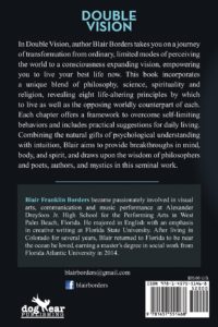 In Double Vision, author Blair Borders takes you on a journey of transformation from ordinary, limited modes of perceiving the world to a consciousness expanding vision, empowering you to live your best life now. This book incorporates a unique blend of philosophy, science, spirituality, and religion, revealing eight life-altering principles by which to live as well as the opposing worldly counterpart of each. Each chapter offers a framework to overcome self-limiting behaviors and includes practical suggestions for daily living. Combining the natural gifts of psychological understanding with intuition, Blair aims to provide breakthroughs in mind, body, and spirit, and draws upon the wisdom of philosophers and poets, authors and mystics in this seminal work.